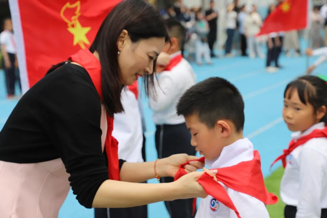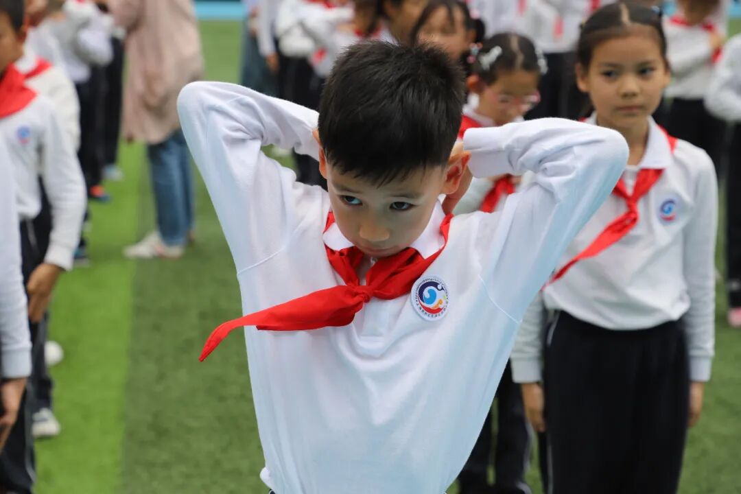 在《领汇》的激昂旋律中,辅导员老师和家长代表庄重地将红领巾交到每一位新队员手中。新队员们在队旗映照下,佩戴好红领巾,稚嫩的脸庞上洋溢着满满的自豪。